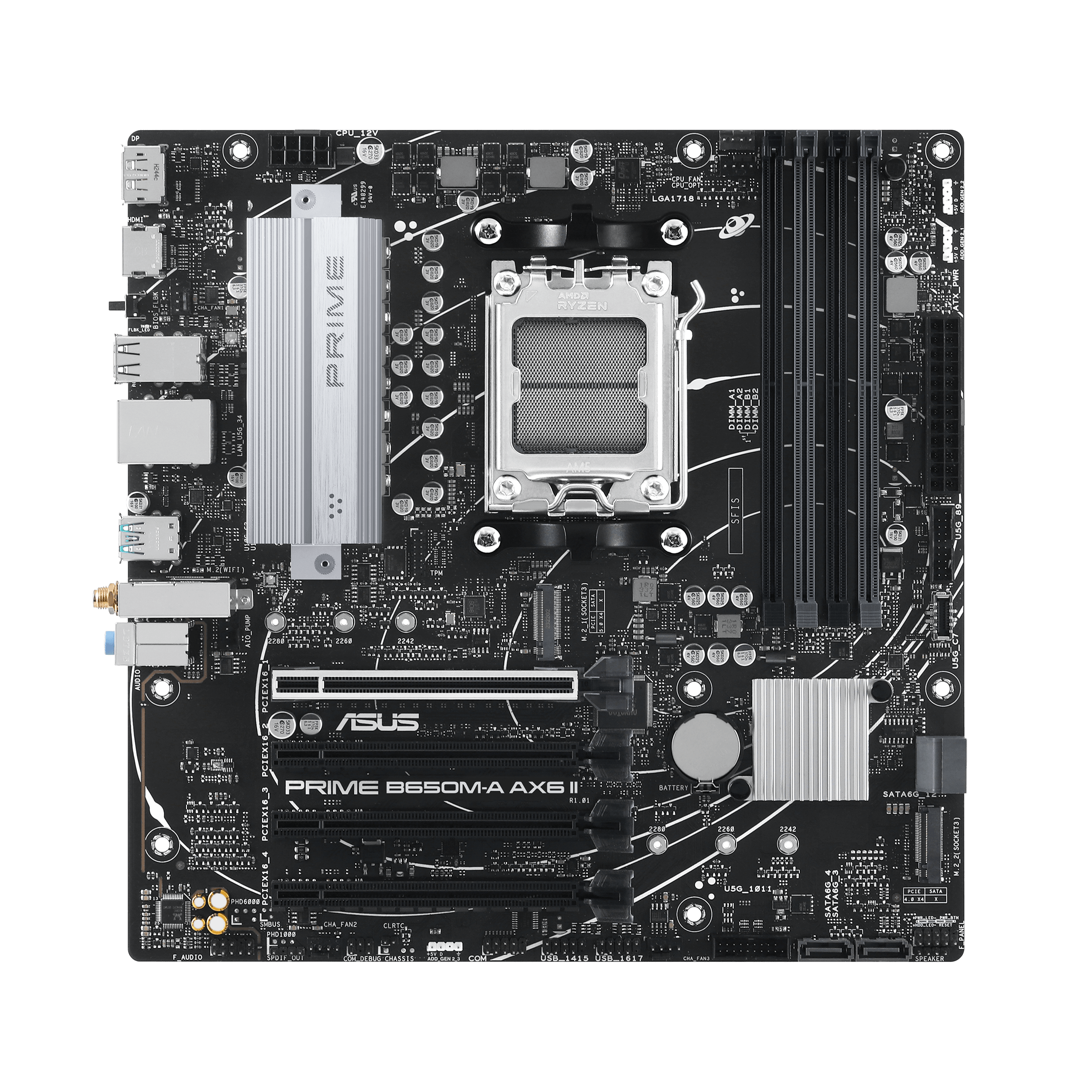 La ASUS PRIME B650M-A AX6 II es una placa base de formato micro-ATX diseñada para el socket AM5, compatible con procesadores AMD Ryzen™ de las series 7000, 8000 y 9000. Es una opción equilibrada para quienes buscan aprovechar la tecnología DDR5 y almacenamiento de alta velocidad.