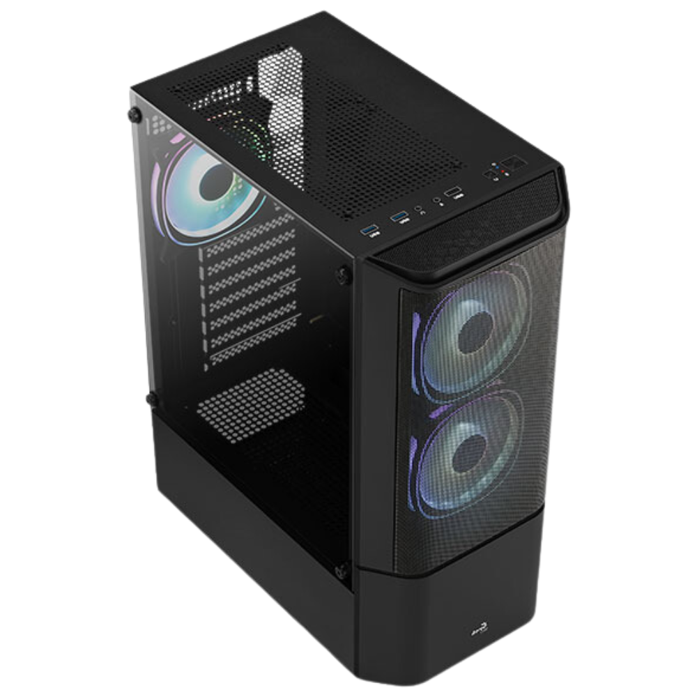 La caja Aerocool Quantum Mesh-G-BK-V3 es un chasis de tipo media torre (Mid Tower) que destaca por su panel frontal de malla (mesh) para un flujo de aire optimizado y un lateral de vidrio templado. Este modelo específico incluye tres ventiladores ARGB de 120 mm preinstalados.