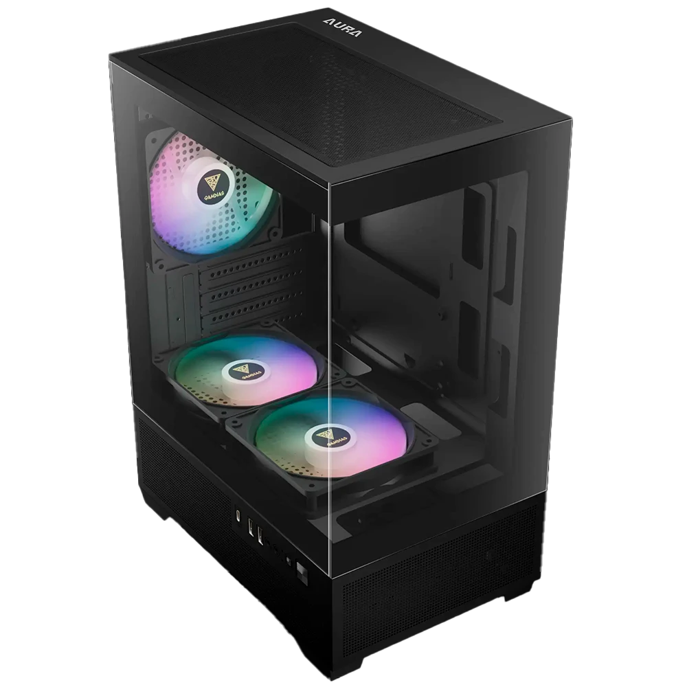 La GAMDIAS AURA GC9M ELITE RGB es una caja tipo Micro-Tower diseñada con un panel panorámico de vidrio templado (frontal y lateral) que permite una visualización completa de los componentes internos. Destaca por incluir tres ventiladores ARGB preinstalados y un puerto USB-C en su panel frontal.