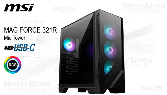 La caja MSI MAG FORGE 321R AIRFLOW es un gabinete de media torre optimizado para refrigeración, con frontal de malla, soporte para hasta 11 ventiladores (4 preinstalados ARGB) y radiadores de 360 mm. Diseñada para alto rendimiento, soporta GPUs grandes de la serie 40 (hasta 390 mm) y cuenta con un panel lateral de vidrio templado, USB 3.2 Gen 2×2 Tipo-C y una placa de control ARGB.