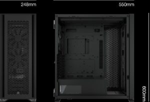 Este chasis ofrece dimensiones de 600 mm x 550 mm x 248 mm y un peso de 18.7 kg, lo que proporciona un volumen de más de 80 litros (hasta un 60% más que una semitorre estándar).