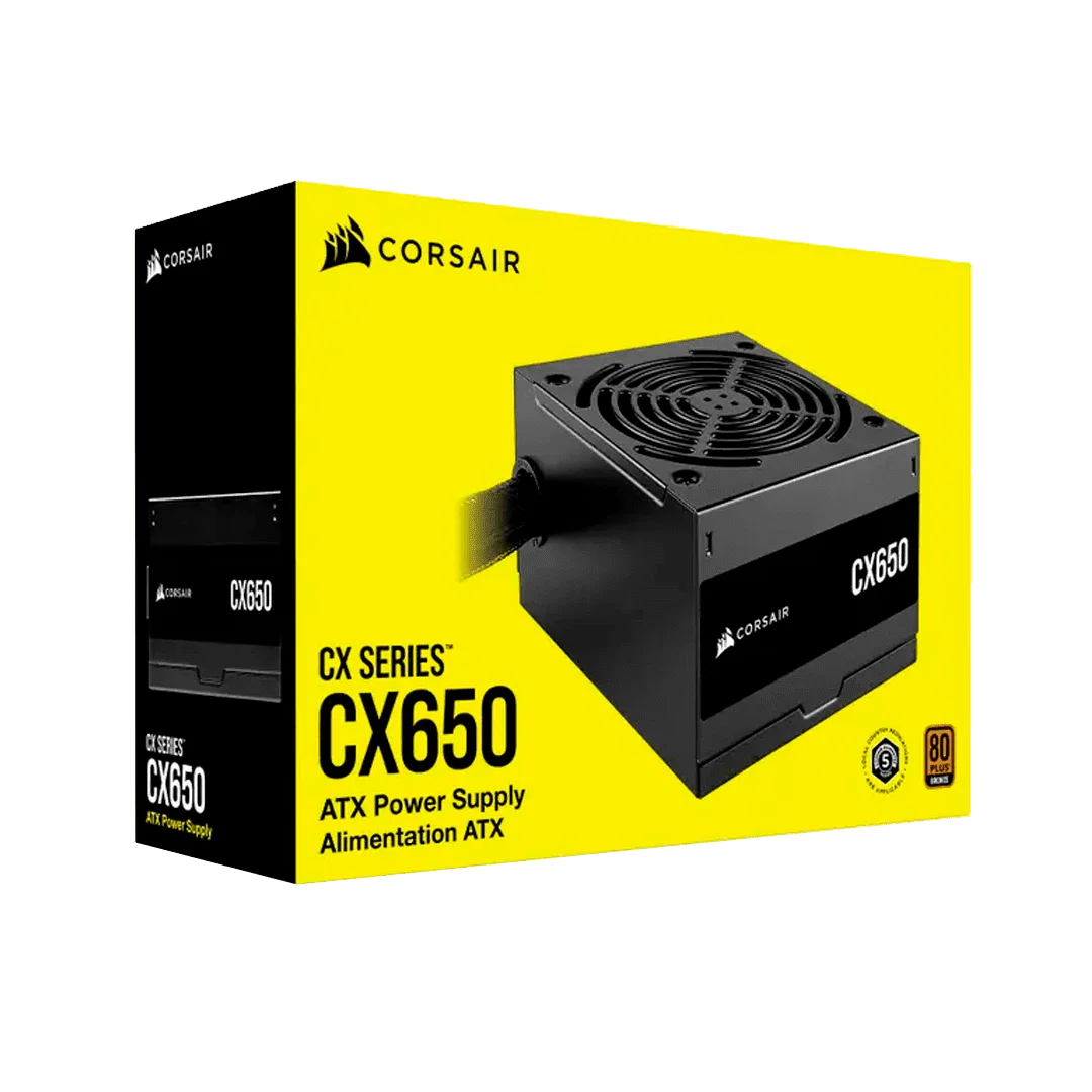 La fuente de poder Corsair CX650 es una unidad ATX de 650W con certificación 80 PLUS Bronze, diseñada para alta eficiencia (hasta 88%) y funcionamiento silencioso. Cuenta con un ventilador de 120 mm, cables negros de perfil bajo y es ideal para PCs gamer de gama media.