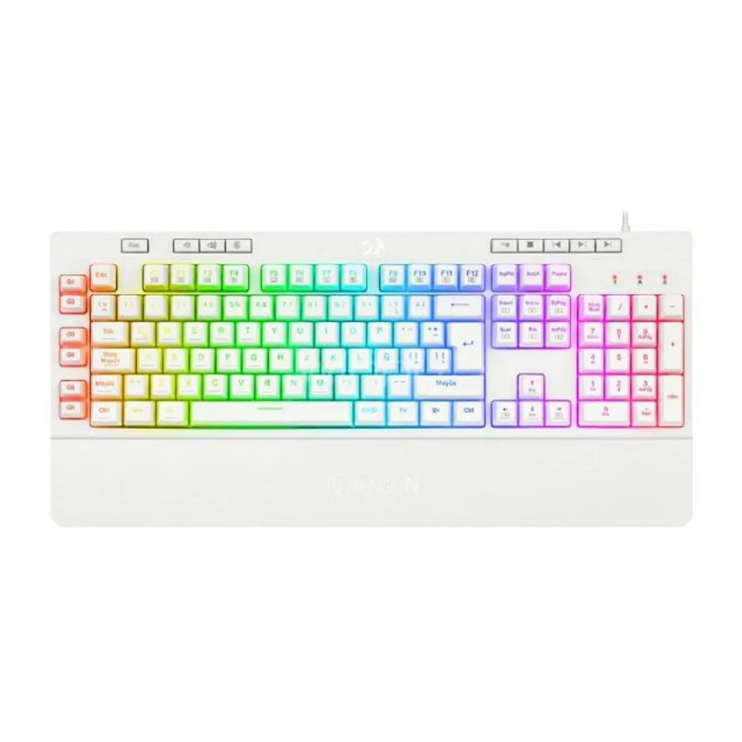 El Redragon Shiva K512W White es un teclado gamer de membrana en formato full size (español) de color blanco, destacado por su retroiluminación RGB, reposamuñecas magnético extraíble, teclas multimedia dedicadas y 6 teclas macro programables sin software. Es ideal para juegos y escritura silenciosa, con construcción robusta y excelente relación calidad-precio.